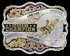 $100 min purchase Continental U.S. only Celebrate the champion with this tri-color scalloped edge buckle. A right side antiqued gold finished figure of your choice sits in a silver finished bright-cut circle. Rose gold finished filigree floats throughout the buckle highlighted by a background of either silver finish or a hand-painted black background. Two ribbon flow around the top and bottom of the circle and alongside the left center placed "2018 Champion" lettering. A top left gold finished flower is accented by a Swarovski Zirconia. Smooth wire trim runs around the curved edges of the buckle with five gold finished high domed beads at each corner. Standard 1.5 inch belt swivel.