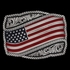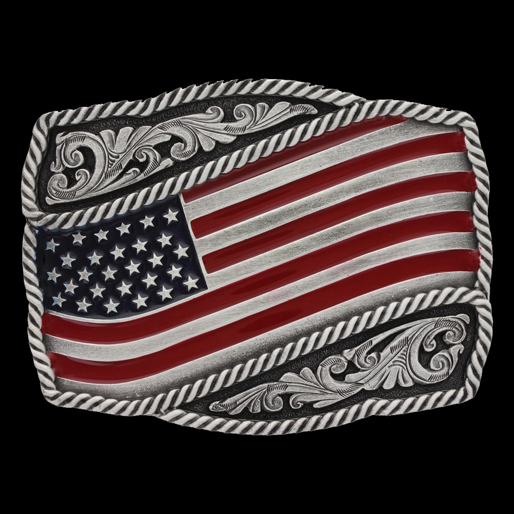 $100 min purchase Continental U.S. only A rendition of a waving flag. A silver finished soft edged cast Attitude buckle with a painted waving flag across the front lined with a twisted rope design around the edge of the flag and the buckle.