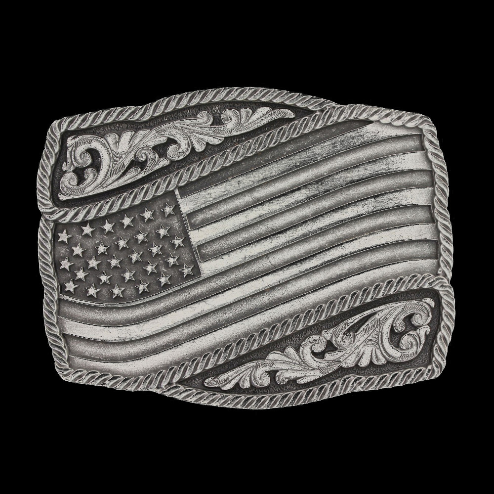 $100 min purchase Continental U.S. only A rendition of a waving flag. A silver finished soft edged cast Attitude buckle with a waving flag across the front lined with a twisted rope design around the edge of the flag and the buckle. Classic western filigree markings decorate the back for added detail.