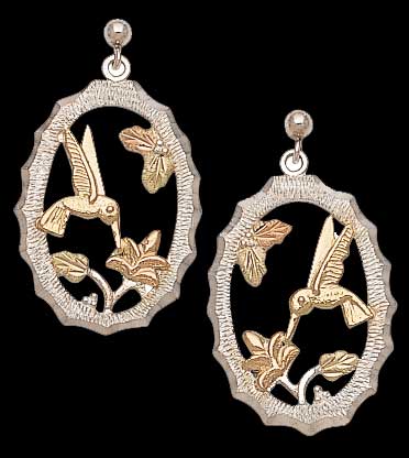 Hills Gold Hummingbird Earrings with sterling silver frames. By Landstrom's Black Hills Gold, the