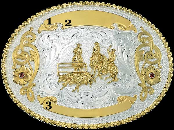 $100 min purchase Continental U.S. only Trophy #2133 by Montana Silversmiths. 3¾" x 5". Trophy buckle is customizable by adding your on message engraved in the ribbon areas. Includes your choice of figures from our figures catalog and your choice of stones. Three engraveable ribbons. Shown with Team Penning figure #223.