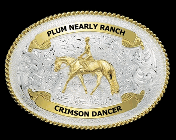 $100 min purchase Continental U.S. only Basic Trophy Buckle made to order from Montana Silversmiths. 2½" x 3½". Add your engraving to either or both of the two ribbons. Shown here with Pleasure Horse figure #449. Made with Montana Silversmiths famous Montana Armor™ finish, which does not tarnish or chip.